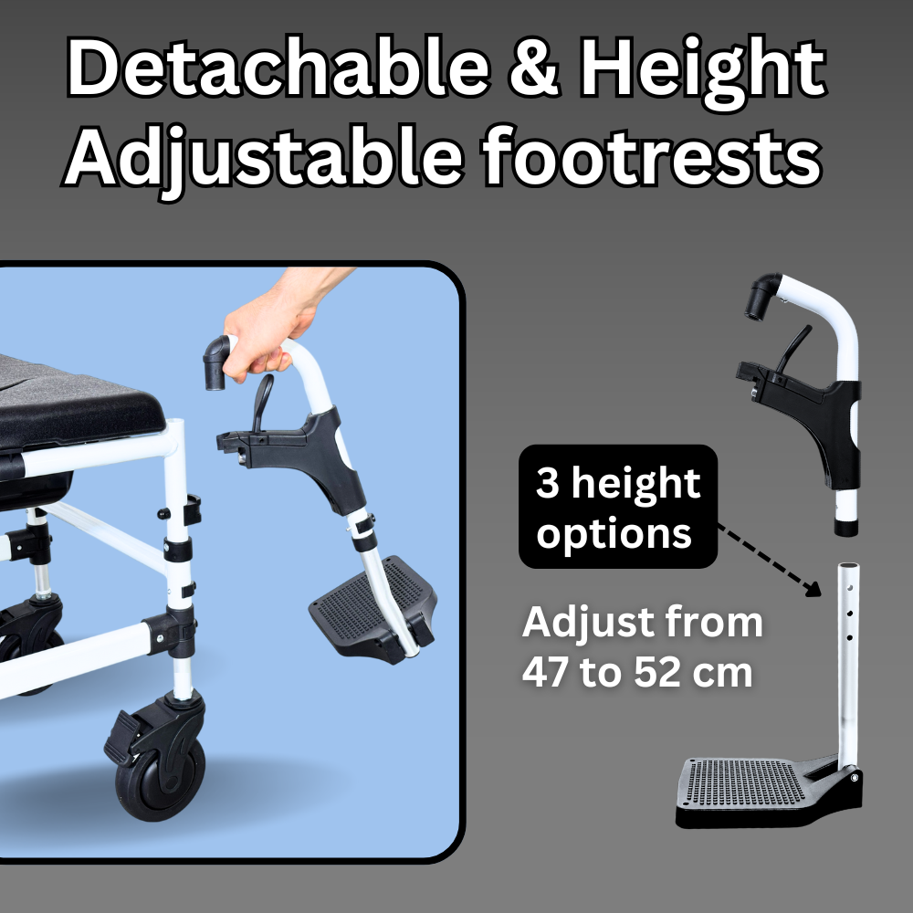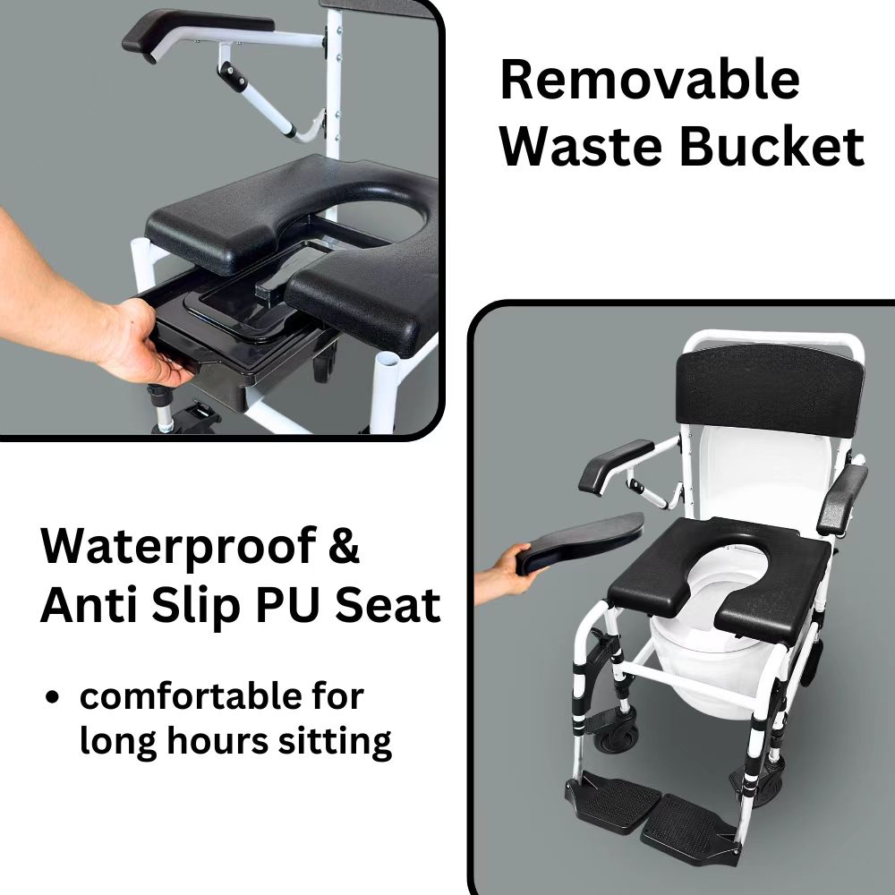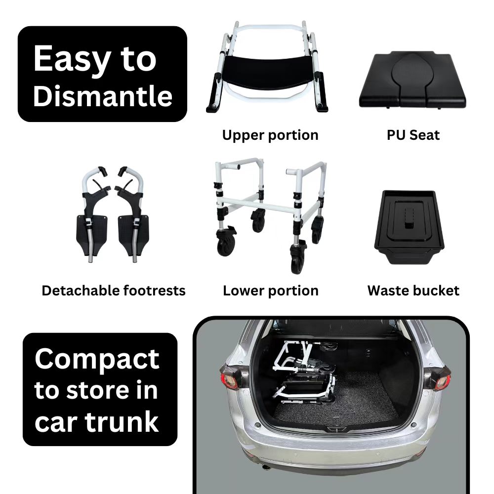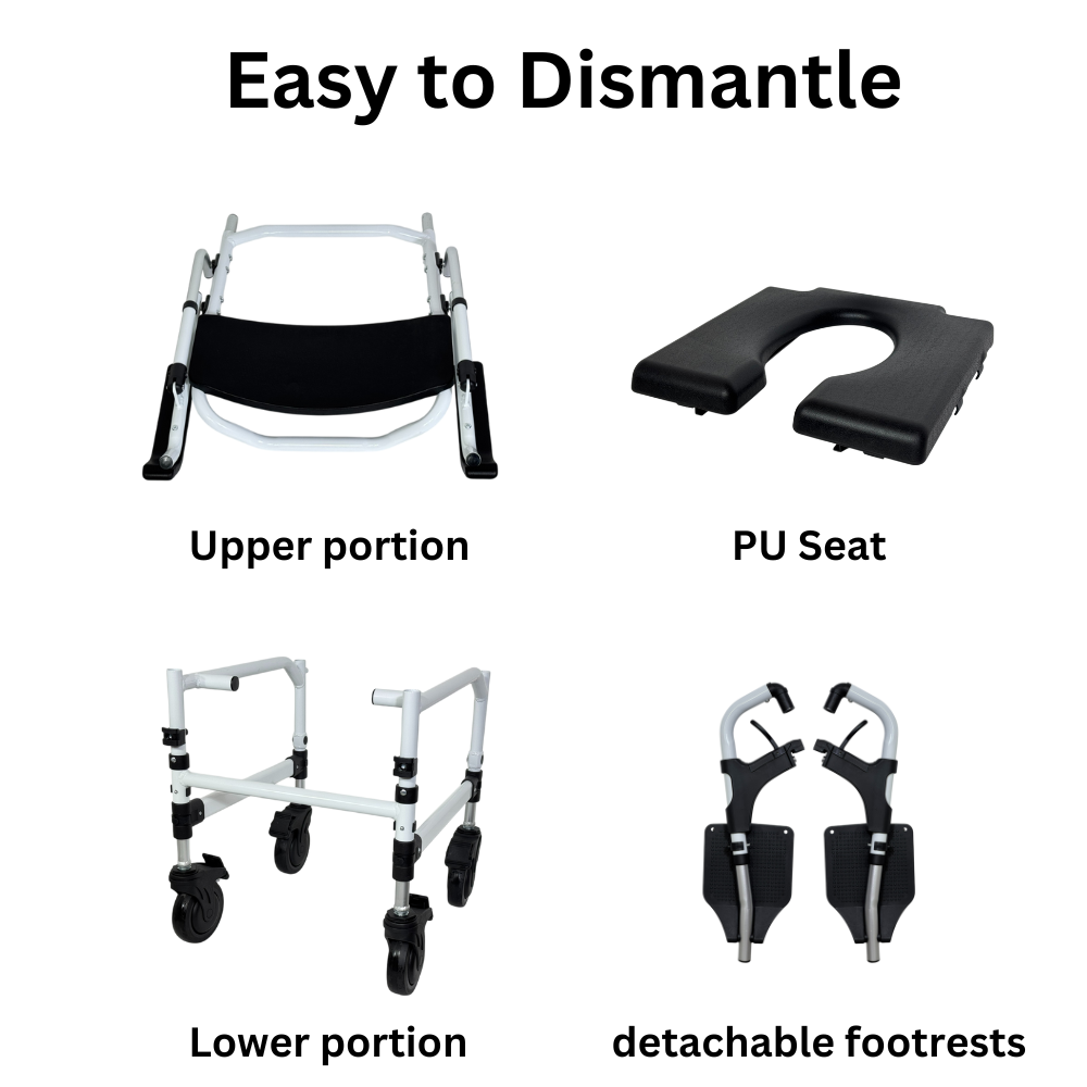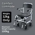The Comfort Commode features a softer PU seat for added comfort. The seat and footrest heights are adjustable to accommodate users of varying heights, and it can be easily positioned over the toilet bowl for hygienic use. The chair can be detached into smaller parts for convenient transport and storage.