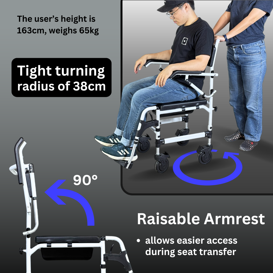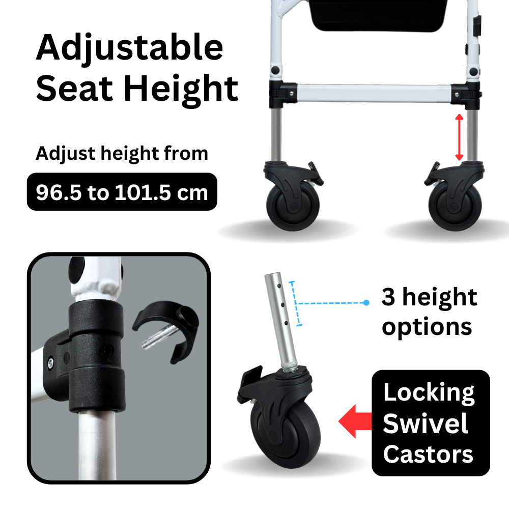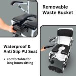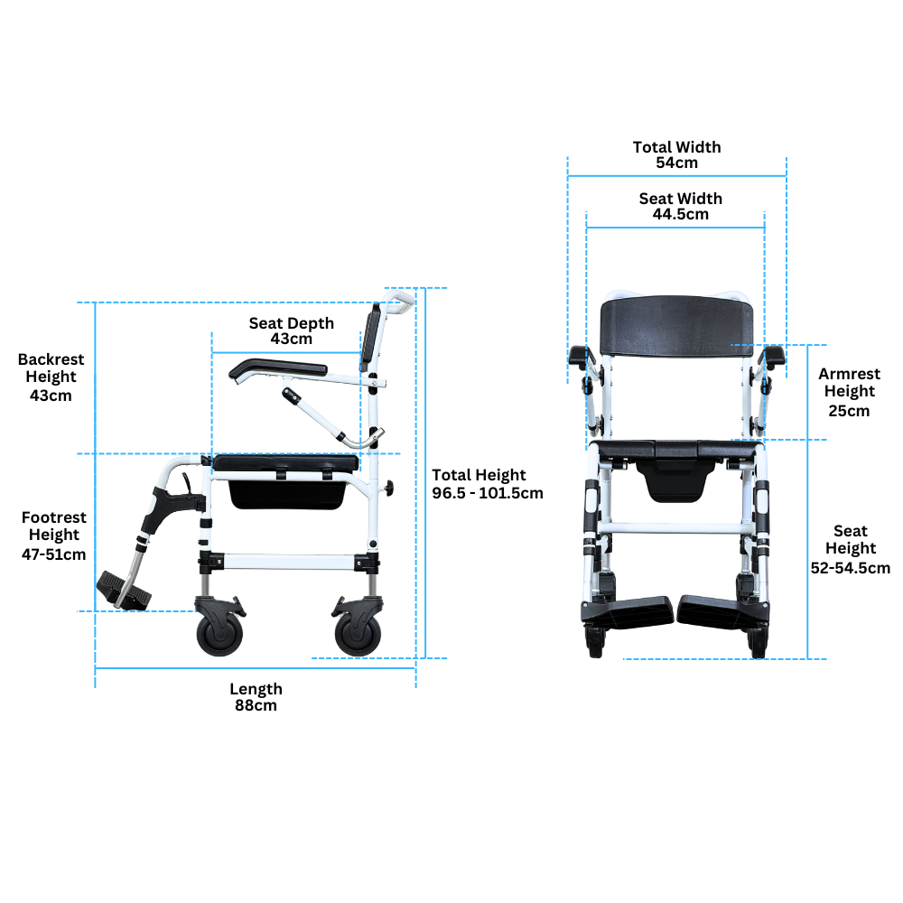 The Comfort Commode features a softer PU seat for added comfort. The seat and footrest heights are adjustable to accommodate users of varying heights, and it can be easily positioned over the toilet bowl for hygienic use. The chair can be detached into smaller parts for convenient transport and storage.